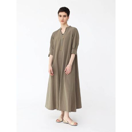 細部のディティールと身体を優しく包み込むようなシルエットが絶妙なバランスのワンピース。胸元のVネックや袖周りにダーツやスリットを落とし込むことで、オーバーなサイジングながらもすっきりと抜け感を演出します。分量たっぷりのフレアシルエットなため、歩くたびになびくドレープが涼し気な印象をプラスし、1着でサマになる夏のおでかけスタイルにおすすめの逸品です。
