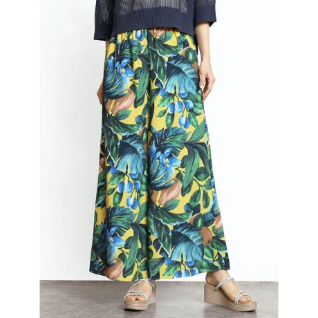大胆なボタニカルプリントが目を引く、リゾート感漂うワイドパンツ。