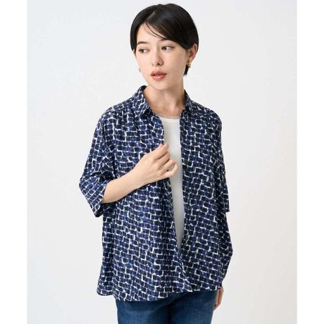 鮮やかな発色と控えめな幾何柄が大人の装いに華やぎをプラス。ゆったりシルエットと肌離れのよい素材感で、暑い季節も快適に。袖丈調整できるロールアップ仕様や、モチーフに合わせた四角い釦など細部にもこだわりを感じる一枚。パンツにもスカートにも好相性です。