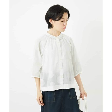 襟は低めのスタンドカラーで、ラグラン切り替えの袖と衿ぐりと袖口にギャザーを入れてやわらかな印象のセンターフロント釦開きのブラウスです。裾のステッチ幅は広めに仕上げてあり、ジャケットっぽくも着こなせていただけます。前を閉じて一枚着としても、前あきで羽織アイテムとしても活躍する一枚です。