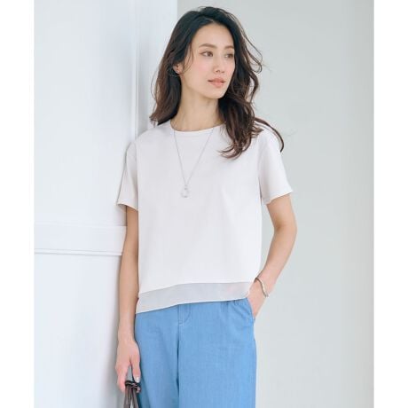 ■デザイン裾にあしらった同色のシアー素材が、シンプルな中に華やぎを添えるシアーデザインカットソー。襟元と袖口には、素材の切り替えを入れることで、さりげないアクセントをプラスしています。腕周りををすっきりと見せてくれる長めの半袖は、1枚で着ても安心感があり、ジャケットインにも好相性。カジュアルときれいめを両立した丁度良いきちんと感が魅力で、幅広いシーンに活躍します。カラーは清潔感のあるホワイト(#001)、柔らかなニュアンスのあるグレージュ(#003)、女性らしさが引き立つピンク(#012)、落ち着きのあるダークブラウン(#035)、肌なじみの良いピスタチオ(#040)、爽やかな透明感のあるアクアグリーン(#061)、シーンレスに活躍するネイビー(#075)の7色で展開します。