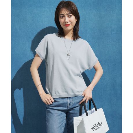 人気のレーヨンポリエステルストレッチ プルオーバー ニットにラメのキラめきをプラスしたニットが今年も登場!袖付け切り替えのないプルオーバーは、動きやすさとストレスフリーな伸縮性で着心地抜群です。カジュアル過ぎない素材感と長めの着丈で通勤スタイルのジャケットインとしてパンツにもスカートにも好相性。程よいリラックス感もあり、夏でも快適に過ごせる大人のニットTとして活躍します。カラーは、涼し気な印象のスカイブルー(#072)、落ち着いた雰囲気のネイビー(#075)、肌なじみの良いゴールド(#090)の3色展開です。