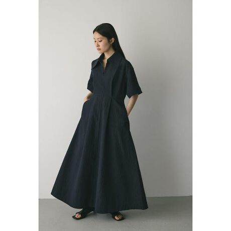 [型番:500ISA33-5241]モデル身長165cm(Mサイズ着用)表面に凹凸感のあるドライタッチな生地を使用したワンピース。顔回りをすっきり見せてくれる大きな襟デザインがポイント。ウエスト切り替えデザインでスタイルアップが叶う一枚です。スラッシュポケット付き。透け感WHTややあり、ストレッチなし。【お手入れ方法】マシンウォッシュ可