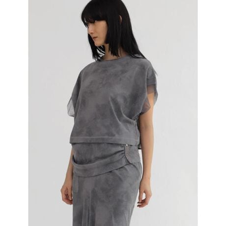 淡いタイダイ柄に染めたLASUDらしいデザインを施したノースリーブとカットソーの2ピースセットアイテム。