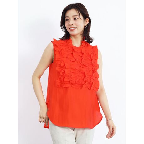 ふんだんにフリルをあしらった華やかなノースリーブブラウス。