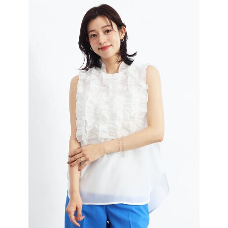 ふんだんにフリルをあしらった華やかなノースリーブブラウス。
