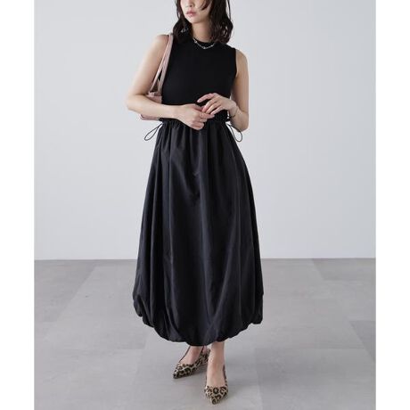 軽量ナイロンのバルーンスカートとノースリーブニットのドッキングワンピース。ニットはスカートの重量に負けて伸びないようプレーティングし、しっかり度目を詰めています。スカートはシャカシャカと音がしない、しなやかなナイロン素材を使用。ウエストはゴムとストッパーでサイズを調節できます。1枚でスタイリングが決まるマストアイテムは、スニーカーやキャップでカジュアルに、ハットやパンプス合わせでフェミニンコーデも楽しめます。※モデルの着用画像の場合、光の当たり具合により、実際の色味と異なって見えることがございます。色味は、商品単体の画像をご参照ください。
