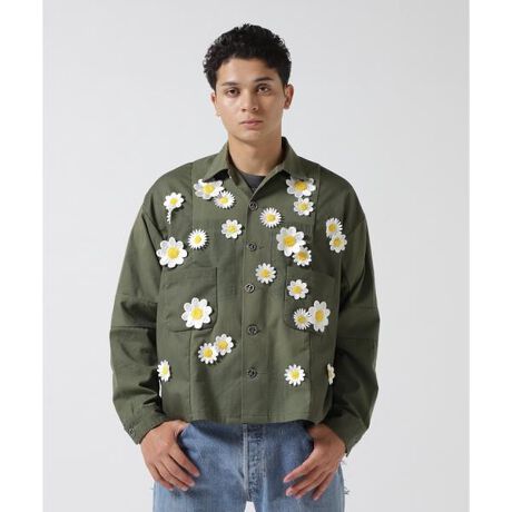 フロントにフラワーモチーフのワッペン、バックにおなじみのスマイリーの刺繍を飾ったインパクトたっぷりのミリタリーシャツ。