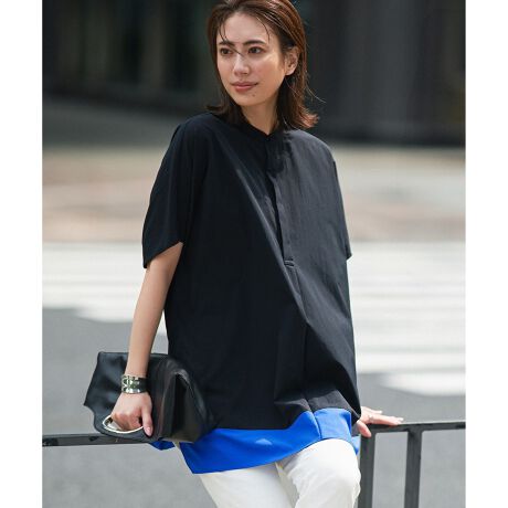 ■デザイン分量感がポイントのバンドカラーブラウスです。ボタンを開けて着用することも可能で、スタイルの変化も楽しめます。裾の配色切り替え、サイドスリット入りのデザインで抜け感があり、パンツに合わせやすい一枚映えするデザインです。