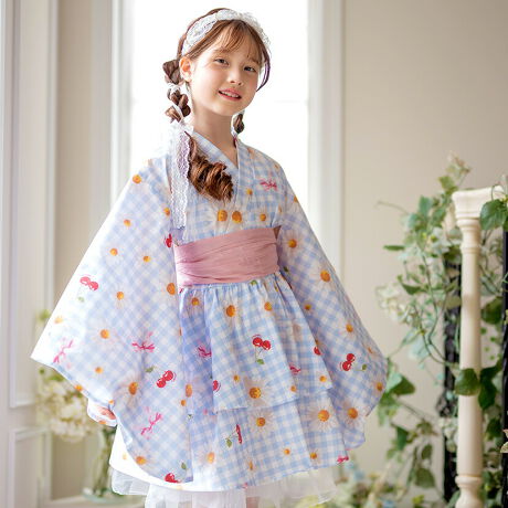 ひざ上丈のティアードスカートでかわいくデザインした浴衣ドレスです。