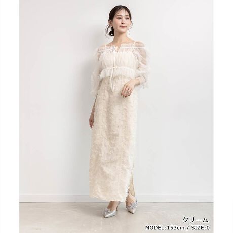 フリルがポイントのチュールブラウスと、ストレートラインのキャミワンピースがセットになったマルチウェイアイテム。