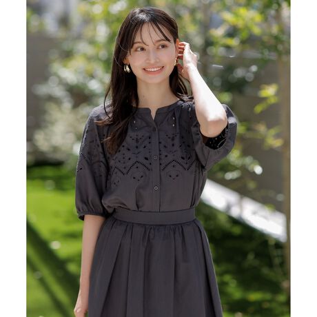 ・クラフト感あるカットワーク刺繍・リネン混に見えながら、取り扱い簡単なポリエステル100%素材・繊細なスラブ糸が織り込まれ、天然素材の様な印象・透けすぎない薄手素材で着やすさ抜群、清涼感もあり