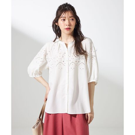 ・クラフト感あるカットワーク刺繍・リネン混に見えながら、取り扱い簡単なポリエステル100%素材・繊細なスラブ糸が織り込まれ、天然素材の様な印象・透けすぎない薄手素材で着やすさ抜群、清涼感もあり
