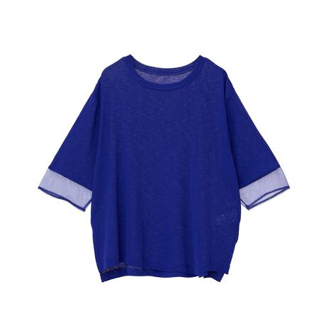 シアー感あるメランジ素材で仕立てた清涼感たっぷりな半袖プルオーバー。肌離れの良いゆったりとしたサイズ感で快適な着心地も魅力です。袖のチュール切り替えや前後差を付けたサイドスリットヘムがスタイリングのアクセントに。