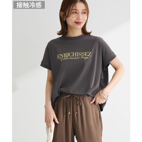 プリントと刺繍を組み合わせた、異なるフォントロゴがポイントのTシャツプルオーバー。ワイドな身幅にコンパクトな丈感が今年らしいデザインです。カジュアルなアイテムながら、フレンチスリーブが女性らしい着こなしを演出。接触冷感性のある綿100%生地で夏の暑い日でも快適に過ごしていただけます。透け感[ややあり]