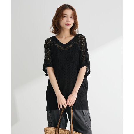 ゆったりとリラクシーな着心地が魅力のニットチュニック。シーズンムード高まる軽やかな透かし編みがポイントです。縦ラインの編み地と緩やかなVネックラインでスタイリングをすっきりとした印象に。1枚で着るのはもちろん、シャツやカットソーと合わせたレイヤードスタイルもおすすめです。透け感[ややあり]