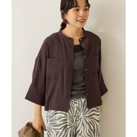 接触冷感のレーヨンベース素材を使用したノーカラーシャツ。落ち感のあるコクーンシルエットに五分丈袖が女性らしく抜け感のあるデザインです。Wポケットとマットに艶めくメタルボタンでアクセントをプラス。シンプルなボトムに合わせて着るだけでこなれたスタイリングに仕上げてくれるおすすめのトップスです。透け感[ややあり]