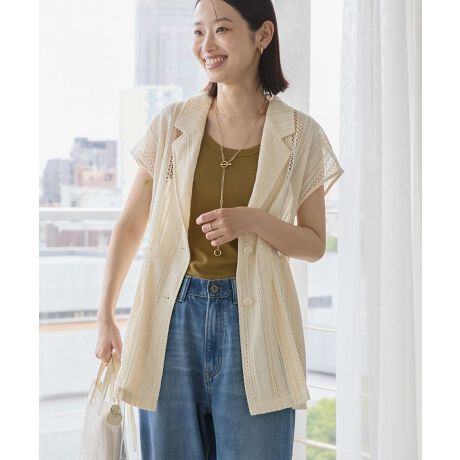 幾何学レースにビックシルエットがこなれ感たっぷりのジャケット。なだらかな落ち感のスリーブレスデザインでレイヤードの着こなしに最適なひと品です。ウエストのドロストを絞ってスタイルアレンジが出来るのも魅力的。パンツからスカートまで幅広く着合わせしていただけるおすすめのアイテムです。透け感[あり]