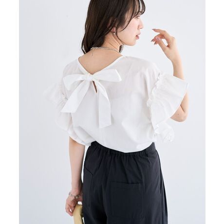 肩の大きなフリルが印象的なブラウス。肌離れの良いきれいめな素材で着心地よく、暑い季節にも快適に着用していただけます。背中のリボンがフェミニンムードを後押し。デニムやスカートなど合わせるボトムを選ばず、後ろ姿まで華やかに着映えるおすすめのアイテムです。透け感[ややあり]