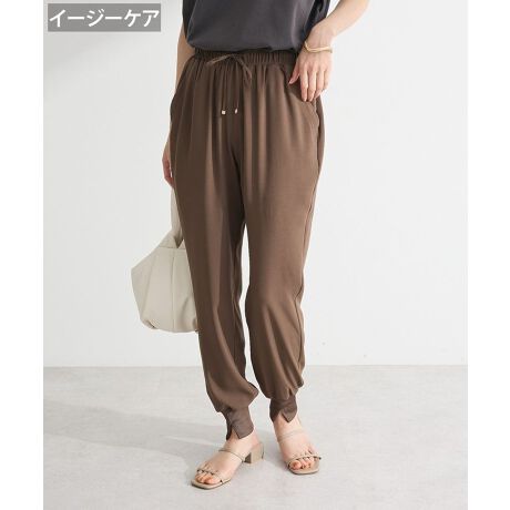 デイリーからオフィススタイルまで幅広く活躍してくれるきれい目ジョガーパンツ。ジョーゼット調のツイル素材はしなやかな落ち感で美しいシルエットを後押しします。ウエストゴム仕様で楽に着脱出来、スリット入りの裾リブがよりすっきりと演出。お手入れしやすいイージーケア仕立てで着回し力も高いおすすめの優秀アイテムです。透け感[ややあり]
