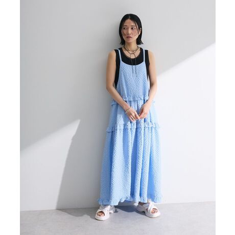 ポコポコとした素材感が可愛らしいキャミソールワンピース。裾に向かって広がるティアードシルエットがフェミニンムードを一層引き立てます。肩紐は背中でリボンに結び、お好みのフィット感に調整できるのも魅力的。Tシャツやジャケットとカジュアルに合わせたスタイリングもおすすめです。透け感[ややあり]