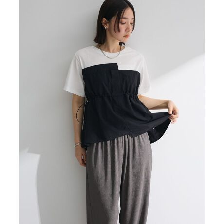 ・シンプルなクルーネックの5分袖カットソーに、軽やかなナイロン素材のビスチェ風デザインをドッキング