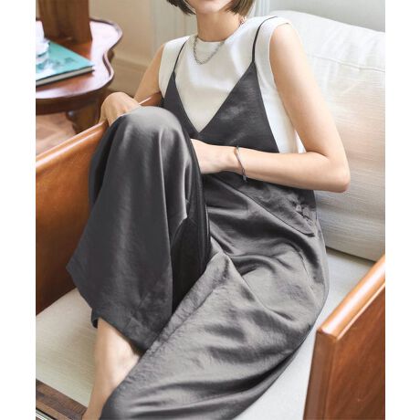 着るだけでこなれた印象に仕上がる、Vカットサテンオールインワン。