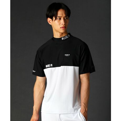 大胆にボディの上下を切り替えたバイカラーデザインが目を引くストレッチハイネックカットソー