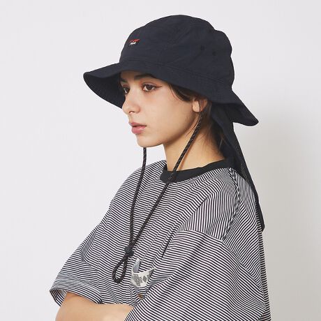 フロントよりバッグのブリム(つば)の長さを長く設定されていることにより、日焼け予防になるのは勿論のこと日焼け布は着脱可能だから、お好みに合わせて取り外しができる。