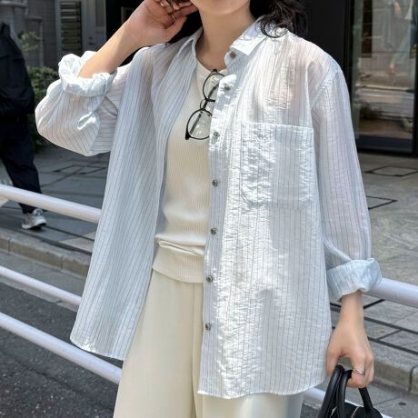 ・軽やかな素材で涼しく着用できるストライプシアーシャツです