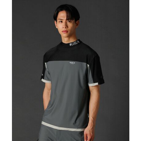 胸元より少し高い位置から袖にかけて、大胆なバイカラーの切り替えデザインを取り入れたインパクト大な一着。そこへさらにもう一色、脇・袖口・裾にアクセントカラーもプラスすることでよりメリハリのあるカットソーへ仕上げました。色だけでなく、LUXE/Rお馴染みのロゴプリントも前横背面の各所に散りばめております。ネックはゴルフのドレスコードに適したハイネックデザインを採用。ワンポイントにブランドロゴの刺繍も入れております。