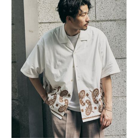 シャツの裾に施されたペイズリー刺繍が印象的な一着。シンプルなワントーンのボディに刺繍を効かせることで、落ち着いた雰囲気の中にほんのり主張を感じさせるバランス感に仕上げました。ワイドすぎない程よいゆとりのあるシルエットで、街でもリゾートでも活躍する一枚です。