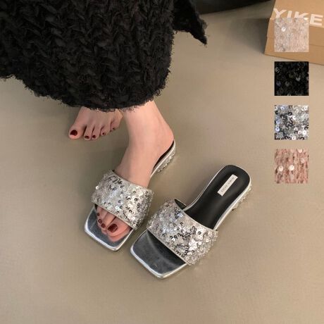 足元にきらめきを添えてくれる、スパンコールが贅沢にあしらわれたミュールサンダル。<br>