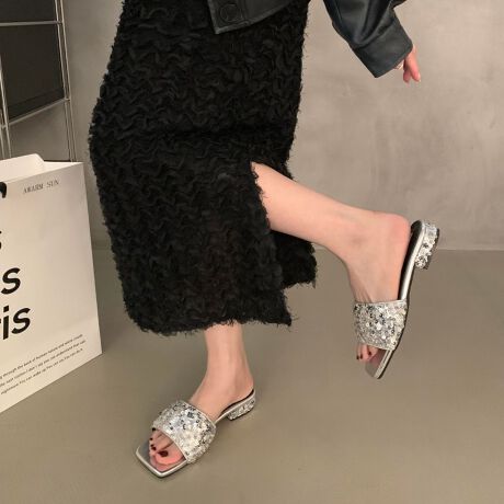 足元にきらめきを添えてくれる、スパンコールが贅沢にあしらわれたミュールサンダル。<br>