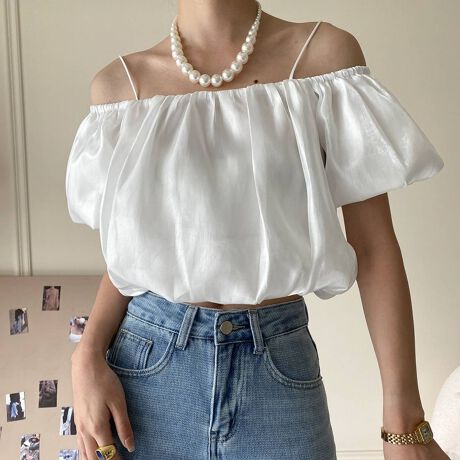 オフショルダーのデザインとパフスリーブが目を引くトップス。<br>