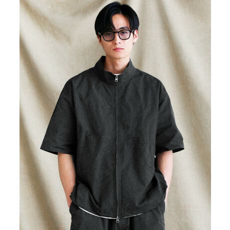 コットンナイロンギャバスタンドネックフルジップ半袖シャツジャケット