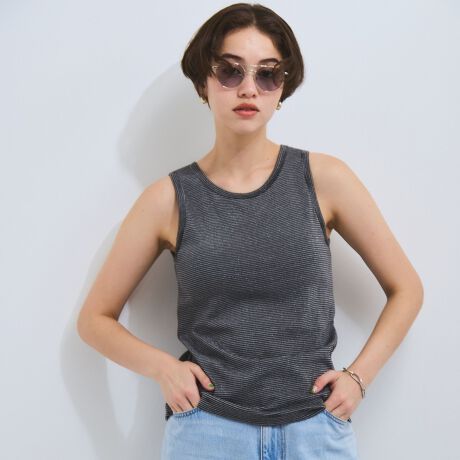 ナローピッチのシルバーラメボーダーのカップ付きタンクトップです。