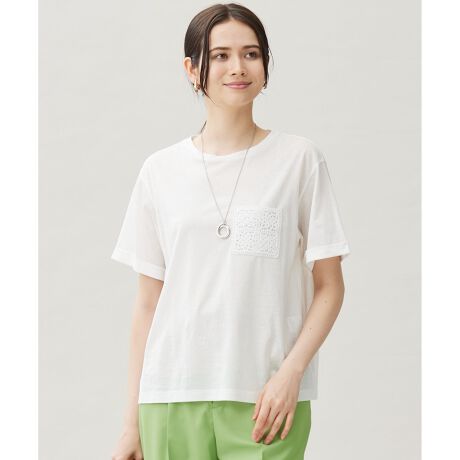刺繍ポケットがアクセントになった柔らかな風合いのTシャツ■デザイン胸元のポケットがポイントになったTシャツです。ポケットにかぎ針風の刺繍モチーフを用いることで、カジュアルな印象になりがちなポケット付きTシャツも、自由区らしい上品な印象になっています。モチーフと素材にこだわった、繊細なカジュアルアイテムに仕上げております。長すぎない程よい丈感なので、スカートやパンツなど様々なボトムと合わせて着て頂けます。■素材肌に優しいぬめり感のある柔らかく艶やかな風合いの超長綿を使用した、毛羽を極限に減らした特殊紡績をしている原糸を使用しています。ハイゲージでしっかり目を詰めて編み立てています。ポケットは、同色の太番手の糸を使用しタイル調の編み柄でポイントを付けています。