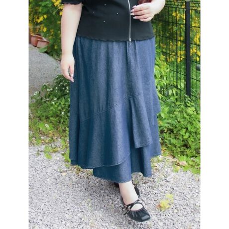 てろんと柔らかな薄手のデニムが夏らしさいっぱいのロングスカート。カジュアルになりがちなデニスカを、歩く度揺れるアシメフリル使いでガーリーにシフト。フロント部分はジップアップのウエストデザインで本格仕様、バックゴムは長めの設定で着心地ラクラクのこだわりデザイン。