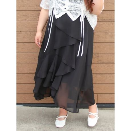 揺れ感の可愛いスカート!前が少し短くなっているので歩くだけで揺れ感が出て上品な一枚!フリルがふんだんに使われているので、気になる足まわりをカバーしてくれます!360度どこからみても上品高見えなスカートです!