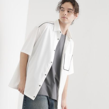 肩合わせとポケットに施されたパイピングがアクセントになったシャツ。