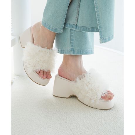 チュールであしらった清涼感あるフリルが華やかな今季らしいサンダルがお目見え。