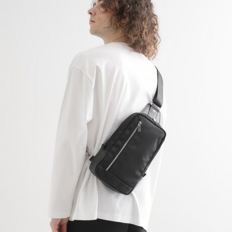 微光沢のある上品な見た目のナイロンと、自然な見た目のシボ感の合成皮革をコンビネーションしたワンショルダーバッグ。