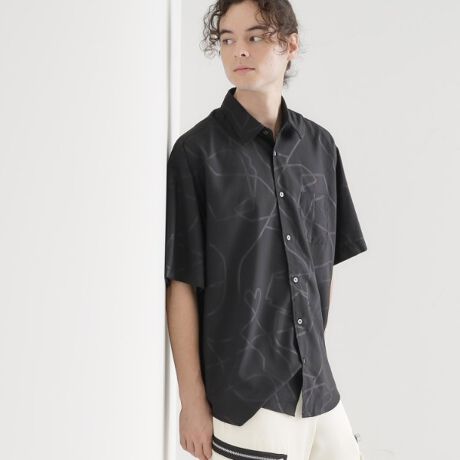 同色系で光沢感のあるのエンボスプリントを総柄に施した半袖シャツ。