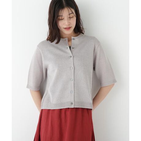 human woman定番人気のミドルゲージギマカーディガンの半袖デザインが登場。脇に畔目を入れた編地コンビのクルーネックカーディガン。長めの半袖で清涼感があります。