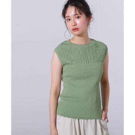 胸元のシャーリングデザインがポイントのニットです。ワンテクが効いてるのでシンプルなボトムスを合わせるだけで映えるデザイン。やや詰まり気味の首元とフレンチ寄りのノースリーブで肌見せバランスも涼しげな印象です。キャミワンピースやサロペットのインナーとしてもオススメ。<素材>ドライタッチでプレーンな糸を使用しています。<詳細>仕様・開閉なし裏地・なし透け感・なし / 光沢・なし / 伸縮性・あり生地の厚さ・普通※モデルの着用画像の場合、光の当たり具合により、実際の色味と異なって見えることがございます。色味は、商品単体の画像をご参照ください。
