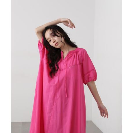 夏にぴったりなレースコットンワンピース。涼やかな襟のカッティングにリボン付き、ボディラインを拾わないシルエット、二の腕をカバーする袖丈です。胸元と袖にはレースをあしらい、適度な抜け感とフェミニンさをプラス。リラックスしたいレジャーやバカンス、タウンユースにもぴったりなカラーとデザインです。キャップやハット、小物使いや足元をサンダルやスニーカーにするなど、フェミニンにもカジュアルダウンにも着回せます。※モデルの着用画像の場合、光の当たり具合により、実際の色味と異なって見えることがございます。色味は、商品単体の画像をご参照ください。