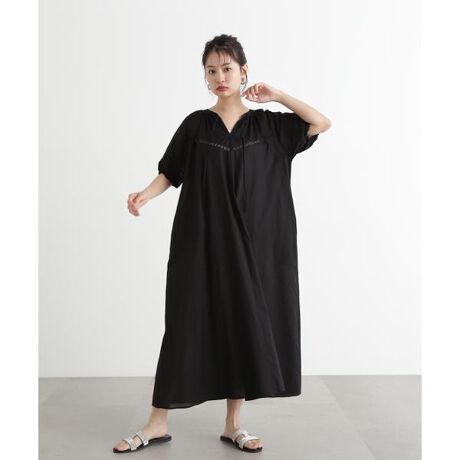 夏にぴったりなレースコットンワンピース。涼やかな襟のカッティングにリボン付き、ボディラインを拾わないシルエット、二の腕をカバーする袖丈です。胸元と袖にはレースをあしらい、適度な抜け感とフェミニンさをプラス。リラックスしたいレジャーやバカンス、タウンユースにもぴったりなカラーとデザインです。キャップやハット、小物使いや足元をサンダルやスニーカーにするなど、フェミニンにもカジュアルダウンにも着回せます。※モデルの着用画像の場合、光の当たり具合により、実際の色味と異なって見えることがございます。色味は、商品単体の画像をご参照ください。