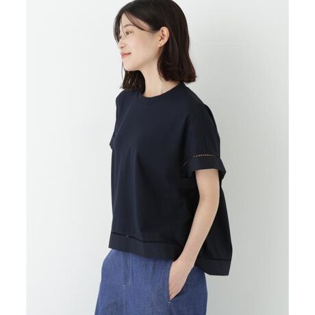ゆったりとしたボリュームが抜け感のあるシルエットのドッキングカットソーです。裾と袖口に布帛素材とハシゴレースをドッキングさせてます。全体にコクーンシルエットと前に振る袖のデザインがポイントです。