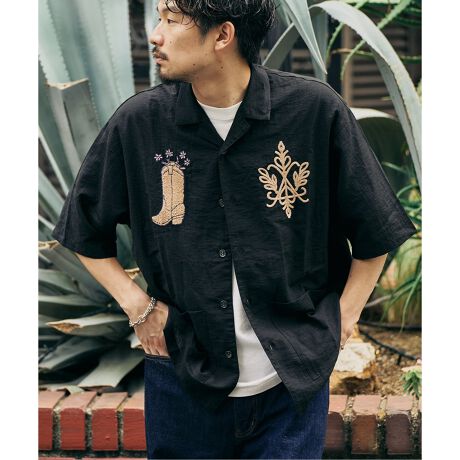 ウエスタンムード漂う刺繍が魅力のオープンカラーシャツ。